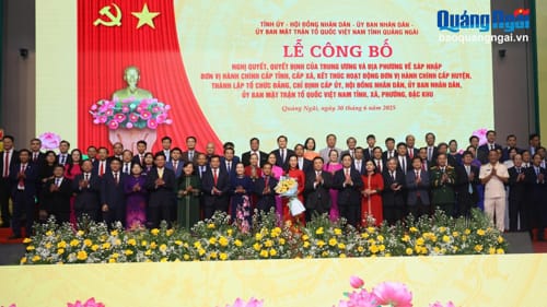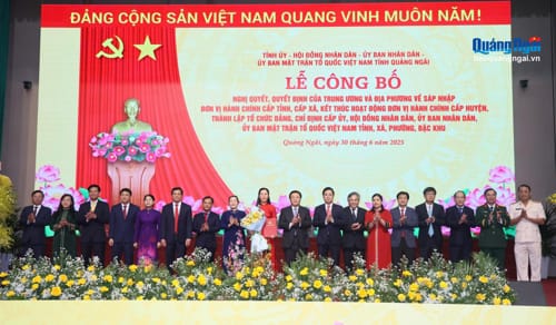 Tại buổi lễ, Ủy viên Trung ương Đảng, Phó Trưởng Ban Thường trực Ban Tuyên giáo và Dân vận Trung ương Lại Xuân Môn công bố Nghị quyết, Quyết định của Trung ương đối với việc sáp nhập tỉnh, thành phố, xã, phường, đặc khu. Theo đó, sắp xếp toàn bộ diện tích tự nhiên, quy mô dân số của tỉnh Kon Tum và tỉnh Quảng Ngãi thành tỉnh Quảng Ngãi mới. Sau sắp xếp, tỉnh Quảng Ngãi có diện tích tự nhiên gần 15 nghìn km2, dân số hơn 2,1 triệu người.