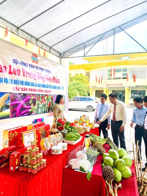 Các đại biểu tham quan gian hàng trưng bày sản phẩm tiêu biểu của nông dân xã Vạn Tường.