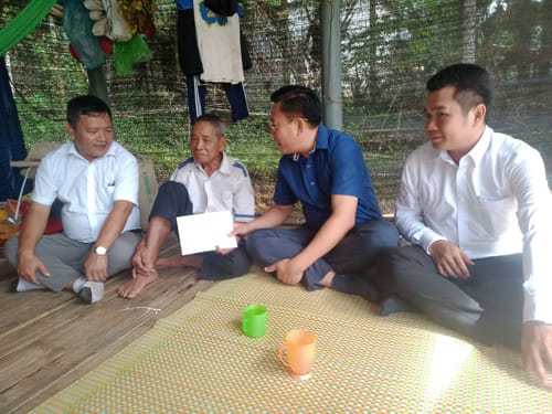 Đ/c Nguyễn Quang Thủy (áo xanh) - Tỉnh ủy viên - Chủ tịch Hội Nông dân tỉnh thăm, tặng quà cho các thương, bệnh binh ở xã Ba Vinh